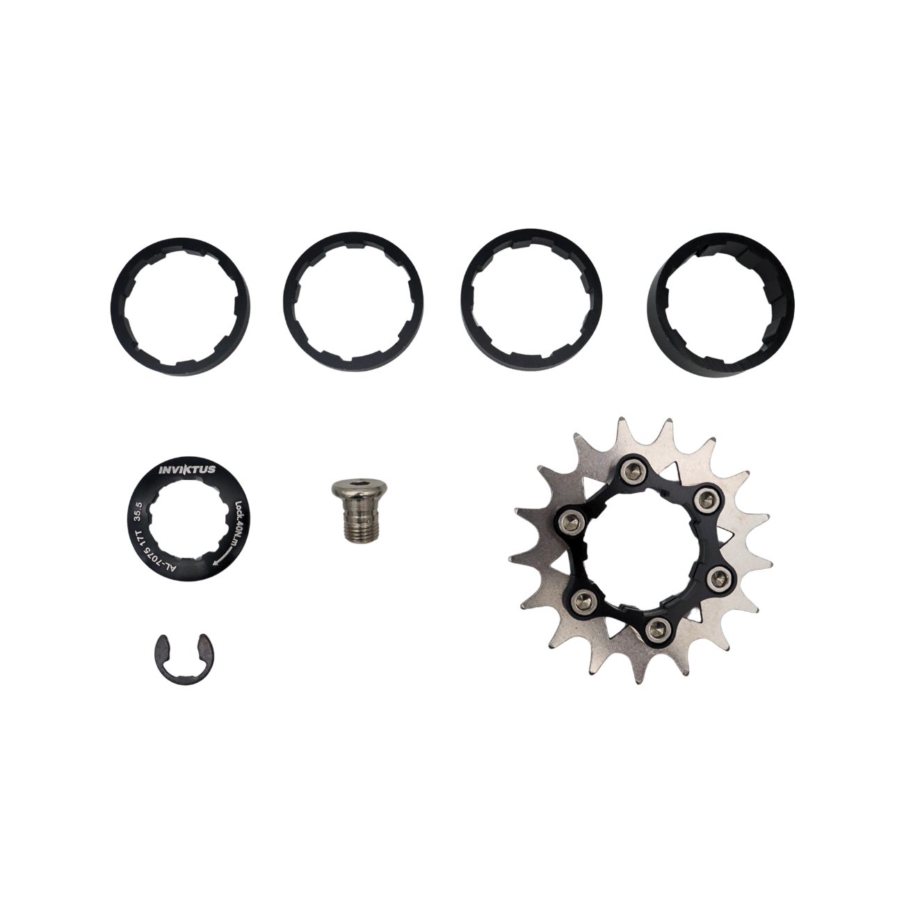Adaptador para conversão de roda livre HG cassete multivelocidades para catraca única de 17 dentes em alumínio com anéis espaçadores e trava + tensionador de corrente para uso em bicicleta de marcha única com ajuste de tensão em alumínio.